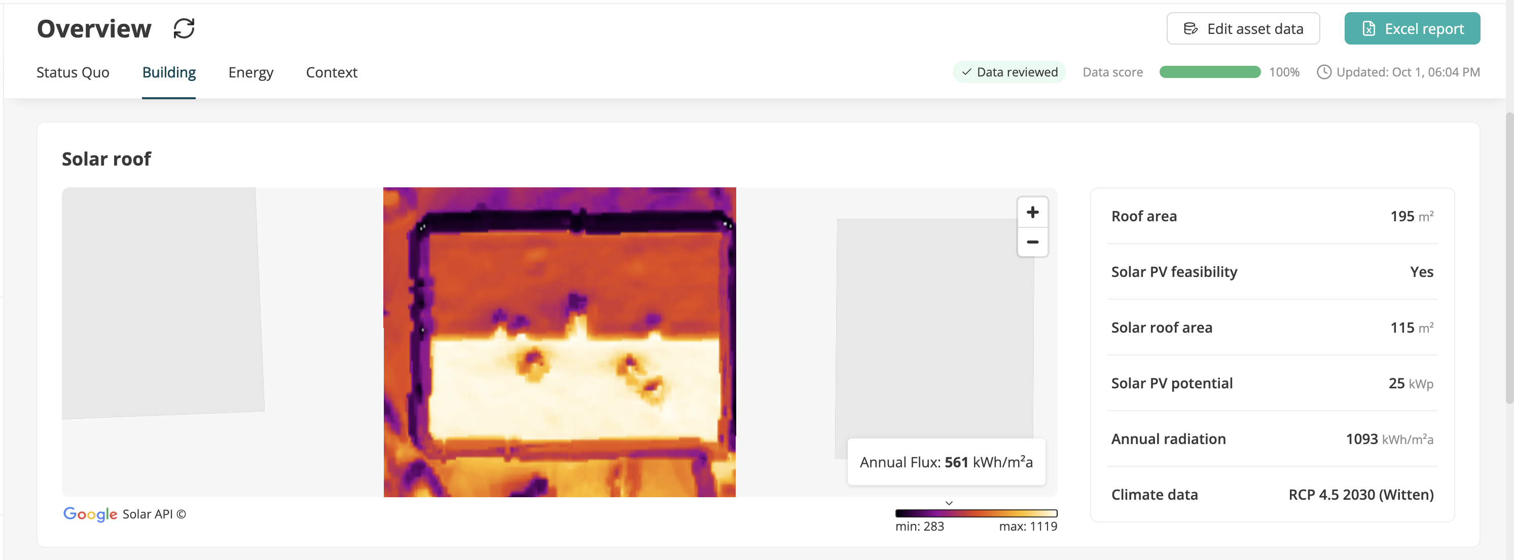 In order to compute current or future Solar PV yields, we retrieve solar irradiation data via the Google Solar API. You can review the estimated potential of your asset on Asset Overview in the “Building” tab. This is simulated automatically, but you have the ability to adjust the Solar roof area in Asset edit directly. The Solar roof area represents the maximum area of the roof, where PV panels can be installed.