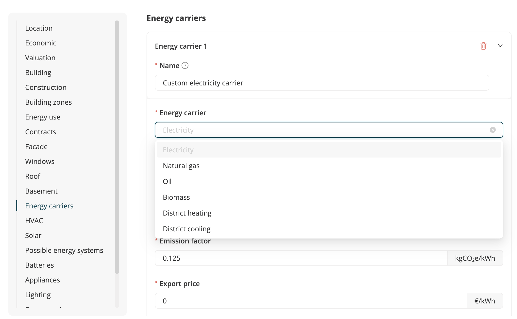 If you want to change the current electricity carrier that was retrieved for this asset, you can simply click on “Edit asset data”, scroll to “Energy carriers”, select to add a new energy carrier and define a new electricity carrier from scratch. You can also set globally available energy carriers on the organizational level, simply go to the homepage of your organization - Data - Context - Energy carriers. You will be able to create energy carriers for certain locations, so that they are automatically available for all assets in a given location.