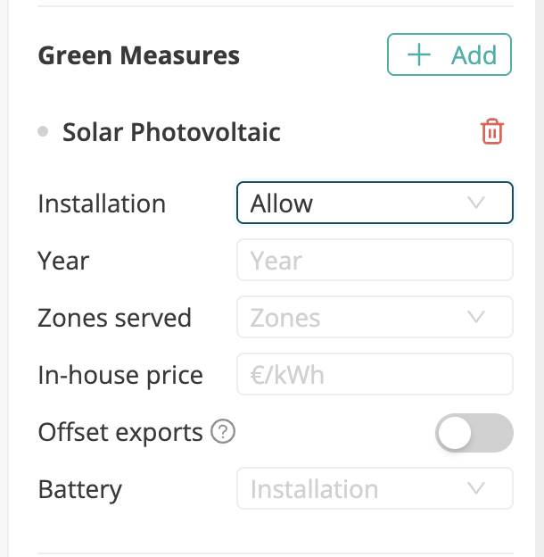 | Offset exports | If enabled, PV exports to the grid are treated as negative operational emissions, reducing total operational asset emissions. | Default = off; can be activated manually. If set to true, the default Optiml strategies will always consider negative emissions. |