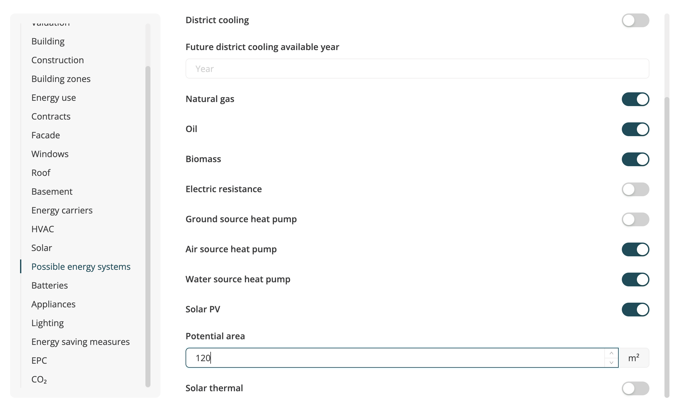 To adjust the available Solar roof area click “Edit asset data”, scroll to “Possible energy systems”, go to “Solar PV”, toggle it on and set the potential area yourself: